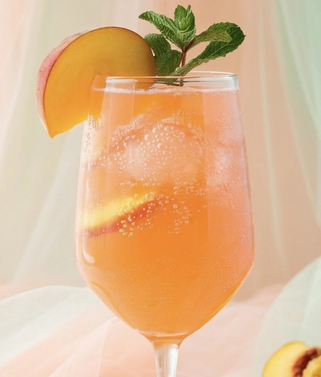 Remplir un verre de glaçons et verser la purée de pêche jusqu'à la moitié du verre