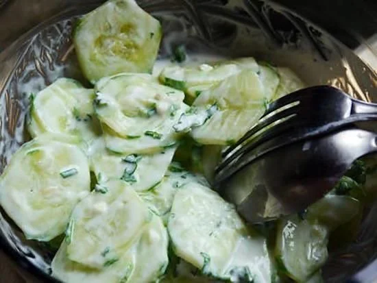 Mélanger le reste des ingrédients dans un bol puis verser sur le concombre.