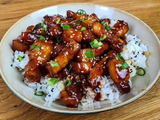 Une fois prêt, servez le riz dans une assiette creuse en disposant le porc au caramel dessus. Pour la touche finale, ajouter les cebètes et un peu de sésame sur le dessus.