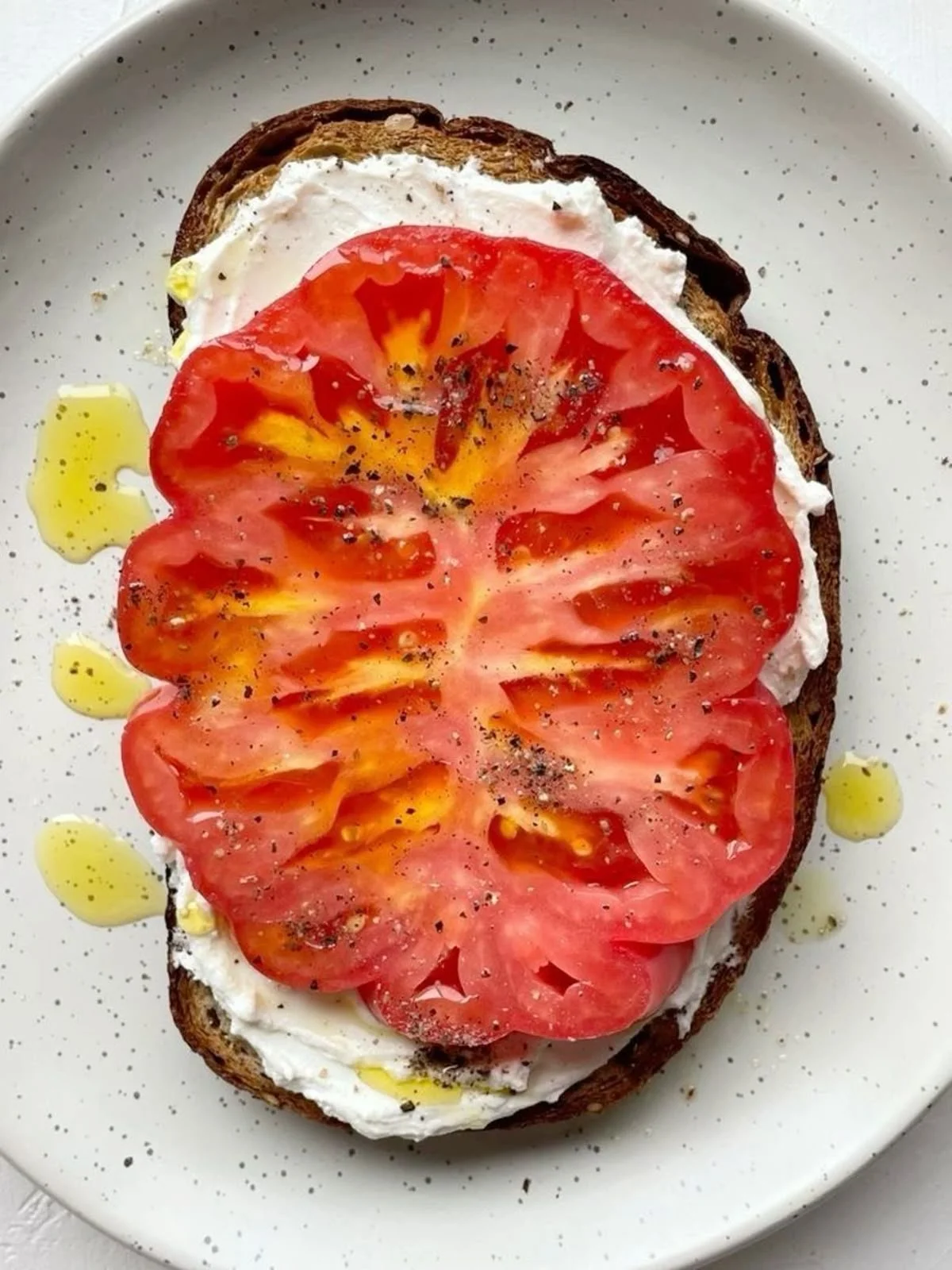 Une fois le pain grillé, tartiner de fromage frais puis ajouter la tranche de tomate sur le dessus.